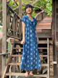 ヘンプ100%のインディゴ抜染プリントのワンピース