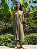紐を首の後ろで結んでホルターネックワンピースとして、また背の高い方ならロングスカートとして楽しめます。