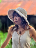 つばの周りのふさふさしたフリンジと、ヘンプ100%のあご紐がアクセント。