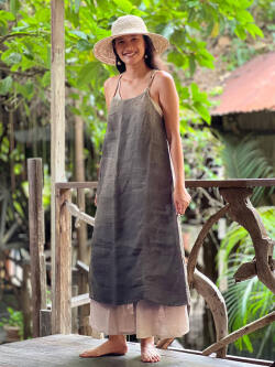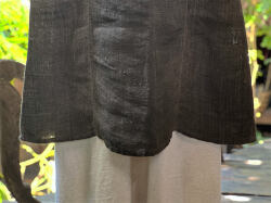 麻炭グレーとマクガのグラデーションが美しく、エプロンドレスのようにも見えるストンとしたラインがシンプルです。
