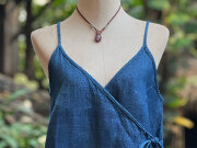 ボタンではなく紐で結ぶカシュクールタイプで身幅は大きめに作ってあります。
