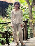 少数民族のデザインをモチーフにしたヘンプ100%のパンツの草木染め