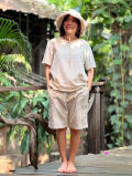 ひざ上丈のカジュアルなポケット付きショートパンツの草木染めです。