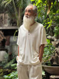 首まわりに色違いのステッチを入れたヘンプシャツ