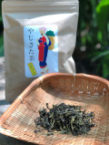 かむあそうトライブスのボーカル やじぃが自然栽培で育てた茶葉を薪火で炒り、 手もみで仕上げた釜炒り緑茶です。