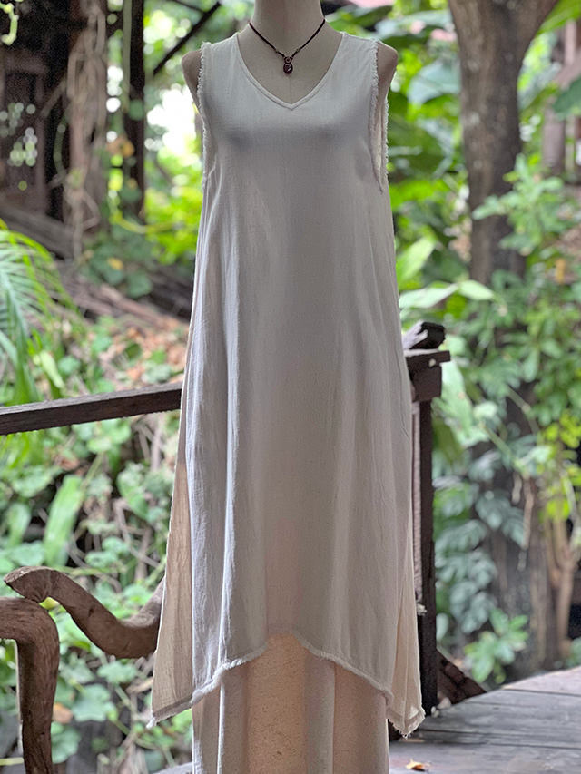 asana HEMP100% 薄手 ノースリーブ フリンジ チュニック・草木染め