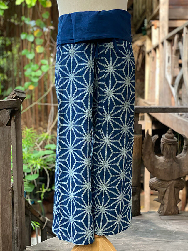 製品名: asana HEMP100% 大麻柄 インディゴ抜染 タイパンツ
