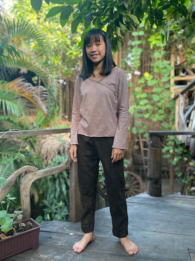 タイ産のオーガニックヘンプ糸とコットン糸で機械編みした、厚手のしっかりとした生地です。 ナチュラル感たっぷりでとても氣持ち良く、長持ちします。 柔らかい糸にこだわっているため、ヘンプ糸がとても細くて、シーズンによって、毎回質感も多少変わってきます。 そして、たまに糸が切れて小さな穴が空いてしまいますが、手仕事でチクチクしていますので、ご了承くださいませ。 これも自然の法則と思い長い間やってきています。 ご理解して頂きありがとうございます。
