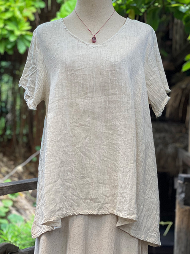 asana 麻100% ゆったり フリンジ Vネック Tee・きなり