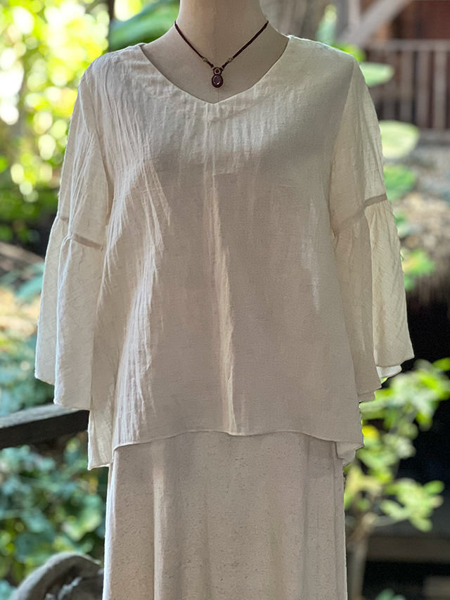 asana 麻100% 薄手 ひらひら ロング ブラウス・きなり