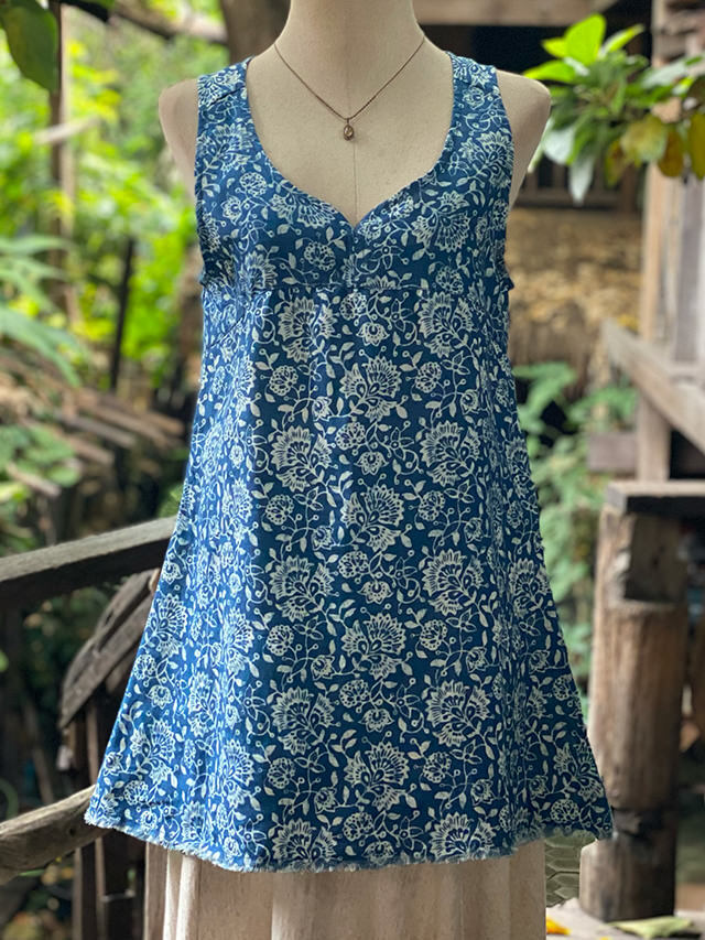 asana HEMP100% ガーゼ タンクトップ・インディゴ抜染プリント