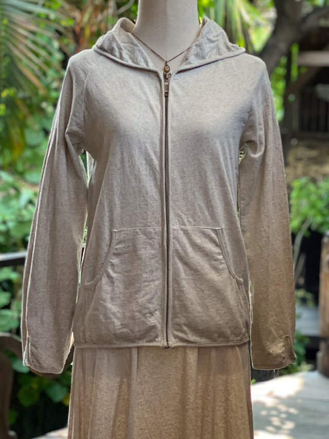 タイ産のオーガニックヘンプ糸とコットン糸で機械編みした、厚手のしっかりとした生地です。 ナチュラル感たっぷりでとても氣持ち良く、長持ちします。 柔らかい糸にこだわっているため、ヘンプ糸がとても細くて、シーズンによって、毎回質感も多少変わってきます。 そして、たまに糸が切れて小さな穴が空いてしまいますが、手仕事でチクチクしていますので、ご了承くださいませ。 これも自然の法則と思い長い間やってきています。 ご理解して頂きありがとうございます。
