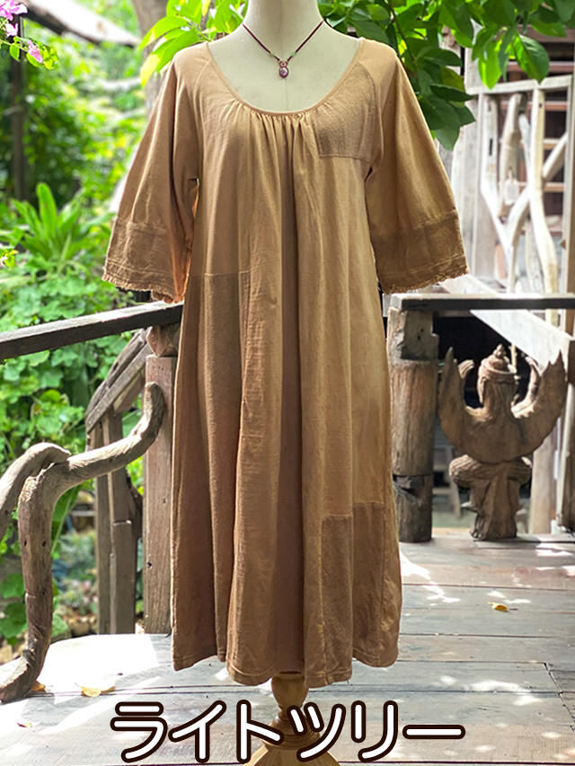 手織りヘンプ100%生地をアクセントに使った七分袖のワンピース