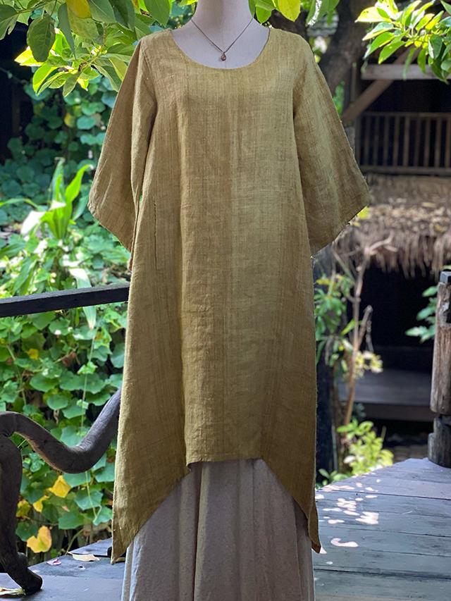製品名: Karma HEMP100% 手織り フレアースリーブ ワンピース・草木染め