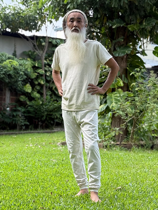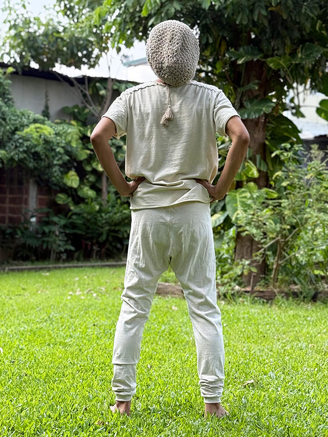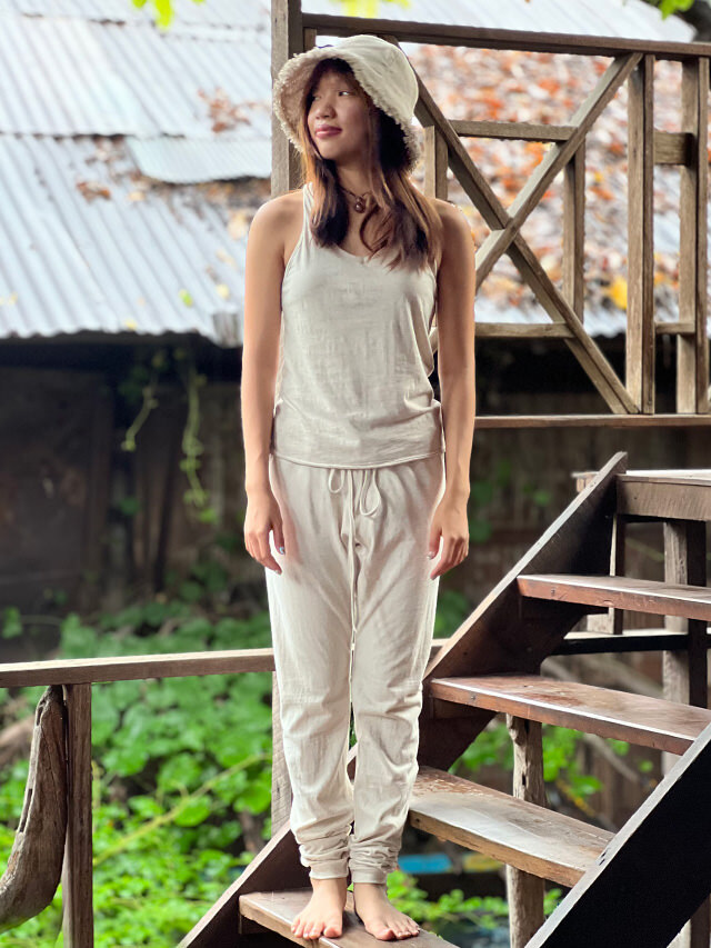 タイ産のオーガニックヘンプ糸とコットン糸で機械編みした、厚手のしっかりとした生地です。ナチュラル感たっぷりでとても氣持ち良く、長持ちもします。柔らかい糸にこだわっているため、ヘンプ糸がとても細くて、シーズンによって、毎回質感も多少変わってきます。 そして、たまに糸が切れて小さな穴が空いてしまいますが、手仕事でチクチクしていますので、ご了承くださいませ。これも自然の法則と思い長い間やってきています。ご理解して頂きありがとうございます。