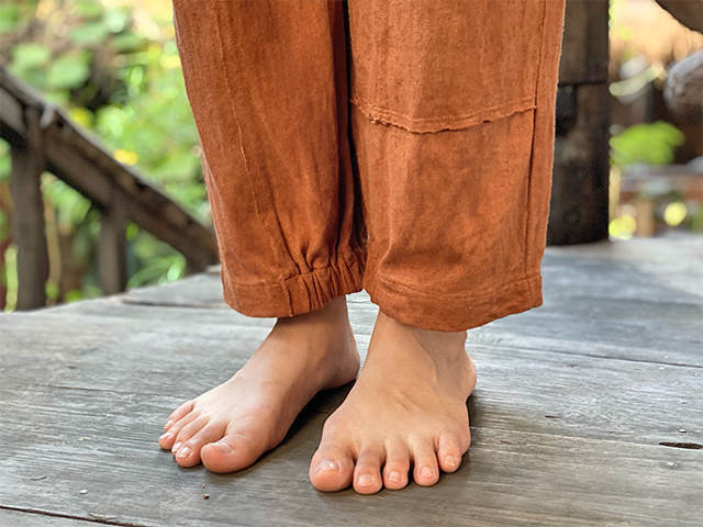 タイ産のオーガニックヘンプ糸とコットン糸で機械編みした、厚手のしっかりとした生地です。 ナチュラル感たっぷりでとても氣持ち良く、長持ちします。 柔らかい糸にこだわっているため、ヘンプ糸がとても細くて、シーズンによって、毎回質感も多少変わってきます。 そして、たまに糸が切れて小さな穴が空いてしまいますが、手仕事でチクチクしていますので、ご了承くださいませ。 これも自然の法則と思い長い間やってきています。 ご理解して頂きありがとうございます。