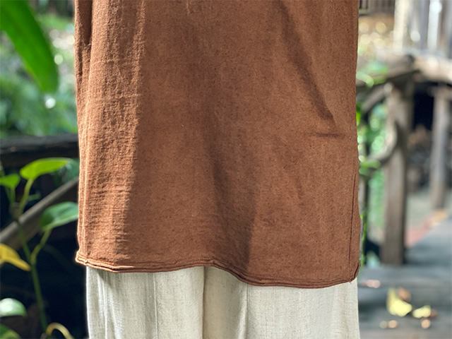 タイ産のオーガニックヘンプ糸とコットン糸で機械編みした、厚手のしっかりとした生地です。 ナチュラル感たっぷりでとても氣持ち良く、長持ちします。 柔らかい糸にこだわっているため、ヘンプ糸がとても細くて、シーズンによって、毎回質感も多少変わってきます。 そして、たまに糸が切れて小さな穴が空いてしまいますが、手仕事でチクチクしていますので、ご了承くださいませ。 これも自然の法則と思い長い間やってきています。 ご理解して頂きありがとうございます。