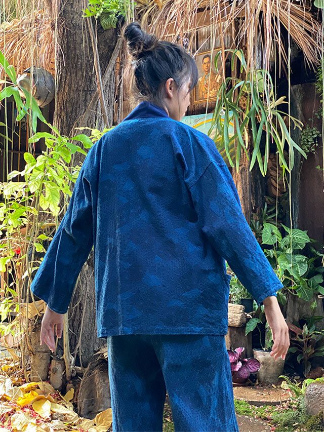 家庭菜園や部屋着に最適!動きやすいもんぺパンツを麻柄プリントのインディゴ染めで