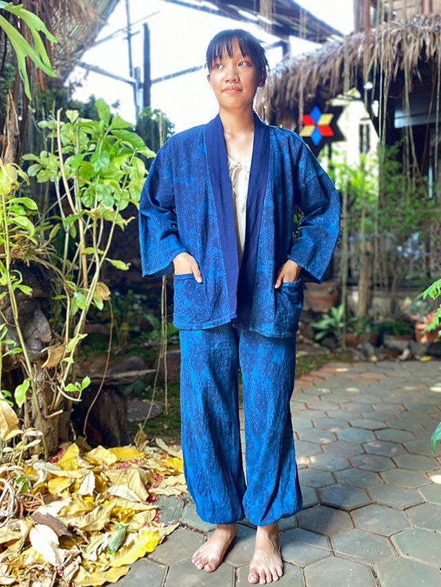 asana 麻柄プリント もんぺ パンツ・インディゴ染め (4種)